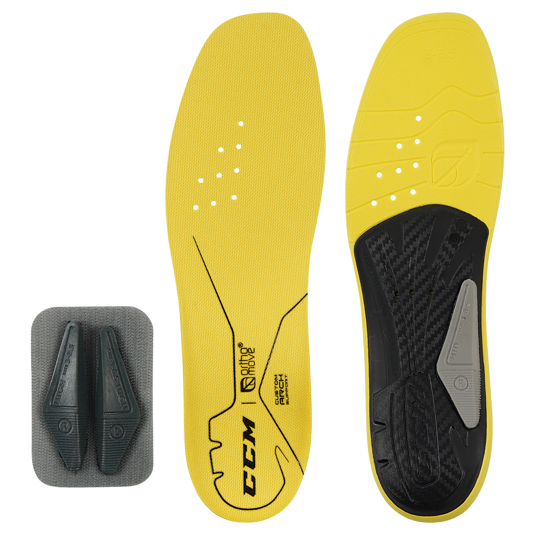 В каждой упаковке CCM предлагает дополнительные вкладыши для среднего и высокого свода стопы. Они прикрепляются к стельке с помощью липучки и позволяют игрокам легко менять эти вкладыши. Для игроков с низким сводом стопы достаточно просто удалить вкладыш.