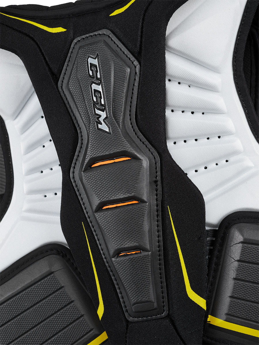 Защита спины: Панель нагрудника так же имеет трехсоставную конструкцию с плавающим, центральным щитком, который закрывает позвоночник и выполнен из пены высокой плотности. Четыре контактные точки на задней панели с эластичным соединением позволяют нагруднику двигаться с телом игрока. Боковые части задней панели выполнены из перфорированной пены средней плотности Foam Armor и пены высокой плотности, которая усиливает защиту и переходит в защиту позвоночника.