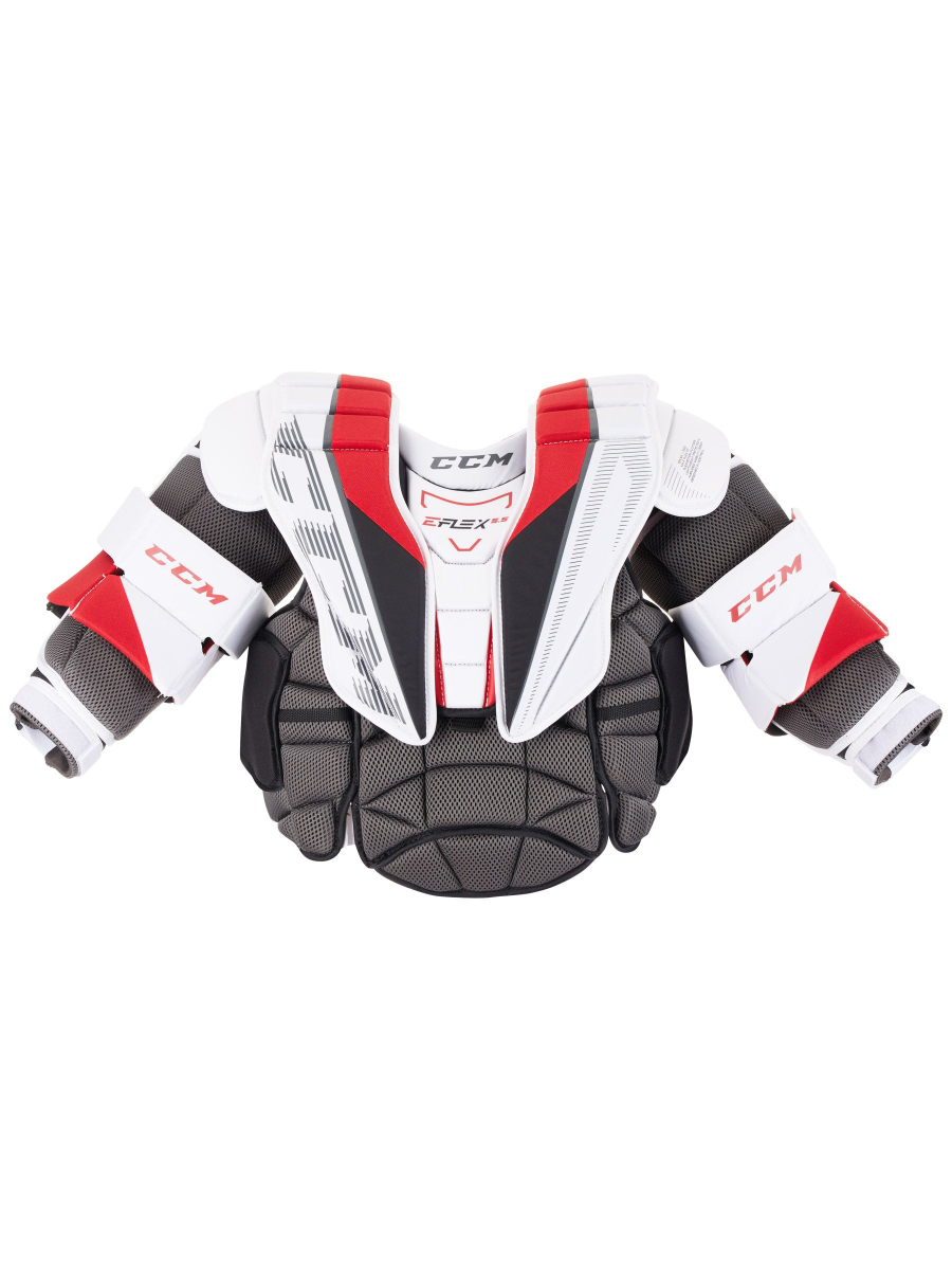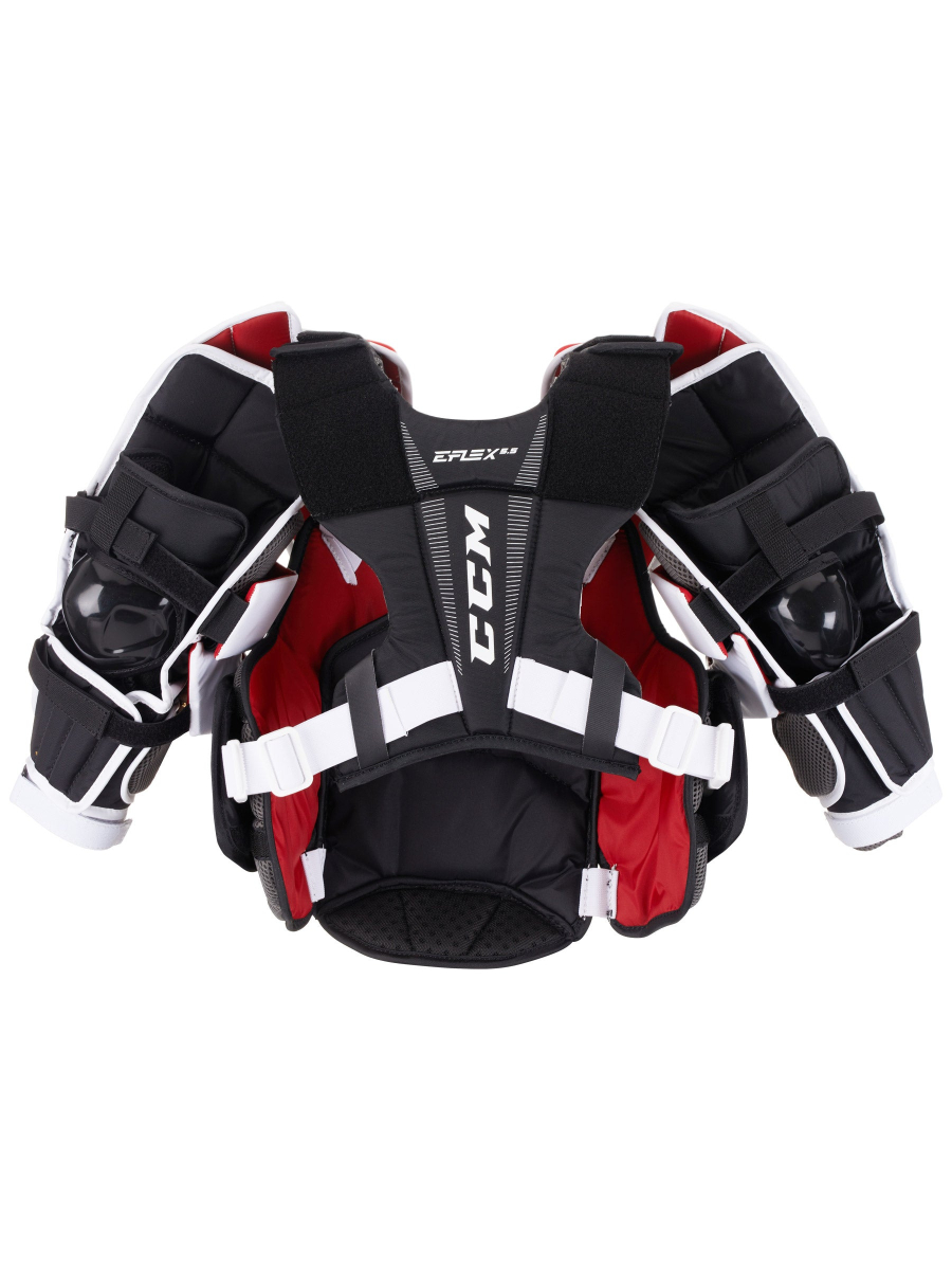 Элементы защиты рук, щиток, закрывающий грудину, и плечевые чаши оснащены системой регулировки Velcro, которая позволяет укорачивать или удлинять защиту. Это дает вратарям любого роста возможность настроить посадку, положение элементов защиты и охват в соответствии со своими индивидуальными предпочтениями. Нагрудник имеет подвижную конструкцию Max Flex Fit, которая обеспечивает максимальную мобильность. Передняя панель имеет сегментированное строение. Щиток, закрывающий грудину, выполнен из плотной пены. Защита живота и ребер выполнена из слоя стандартной пены. Передняя панель оснащена регулируемыми, сегметированными элементами защиты плеча и ключичной области, независимыми элементами защиты локтя и элементами защиты ребер для создания действительно индивидуальной подгонки нагрудника. В качестве защитного, амортизирующего наполнения в элементах защиты используется стандартная пена. Центральный щиток, закрывающий грудину, выполнен из плотной пены. Формованные плечевые чаши выполнены из пены высокой плотности. Налокотники имеют квадратный дизайн, который создает максимальное покрытие в области локтевого сустава. Элементы защиты бицепса и предплечья выполнены из пены высокой плотности и стандартной пены. Задняя панель имеет усиленный элемент защиты позвоночника, выполненный из стандартной пены. Система фиксации позволяет надежно зафиксировать нагрудник на теле вратаря.